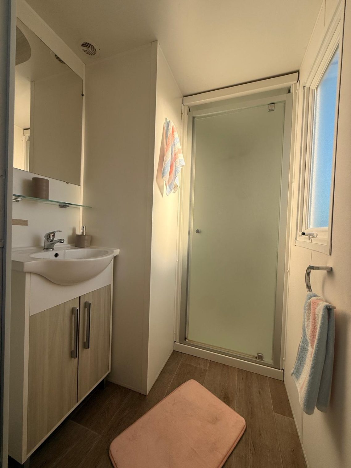 Une salle d’eau est aménagée avec douche et meuble vasque, et les WC sont séparés pour plus de confort.
