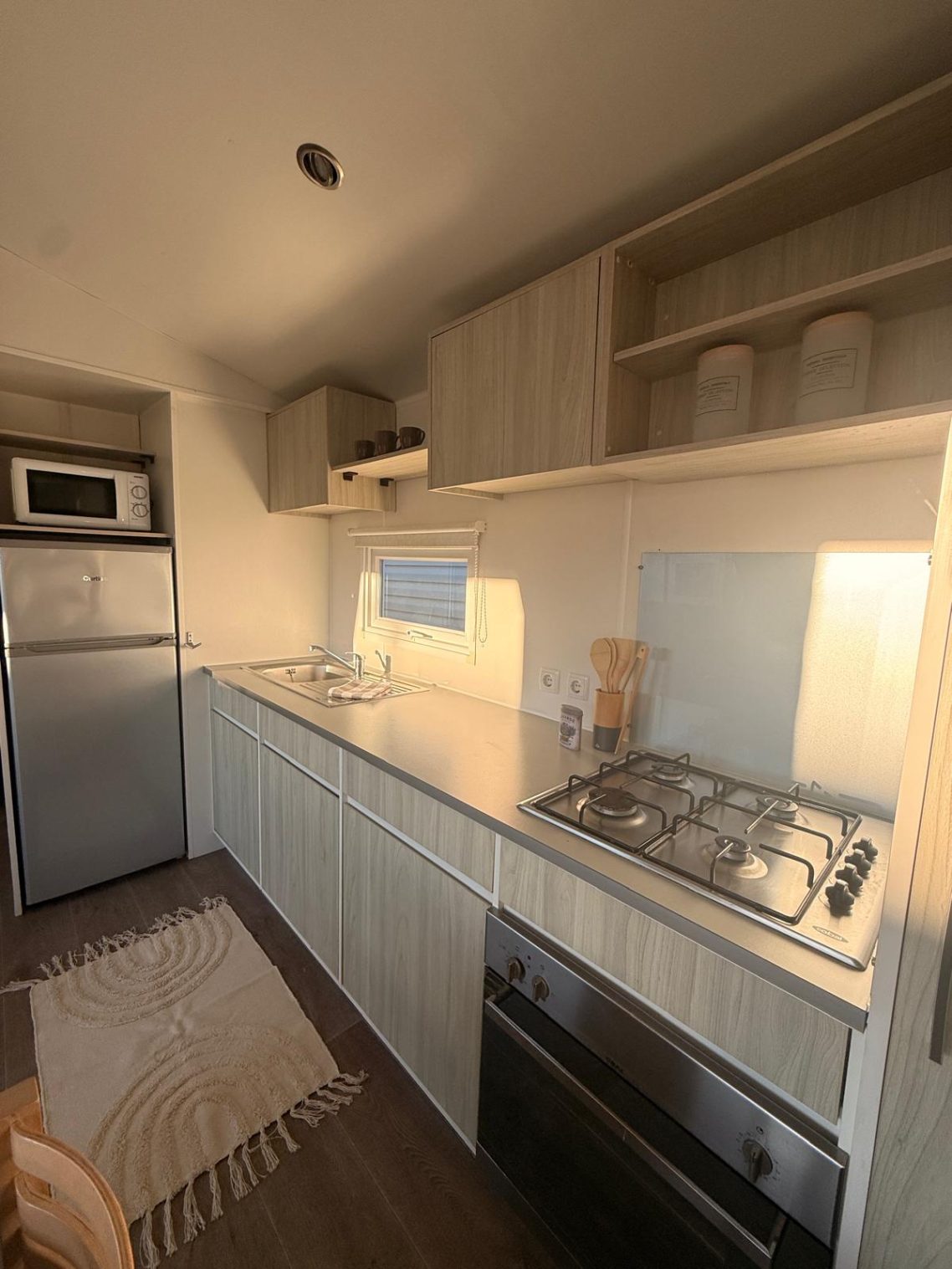 La cuisine, ouverte sur le séjour est équipée pour répondre aux attentes quotidiennes : plaques de cuisson, réfrigérateur/congélateur, four, amplacement micro onde et rangements bien pensés.
